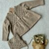 De set heeft overslag (druk)knoopjes en een gebreid patroon.