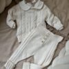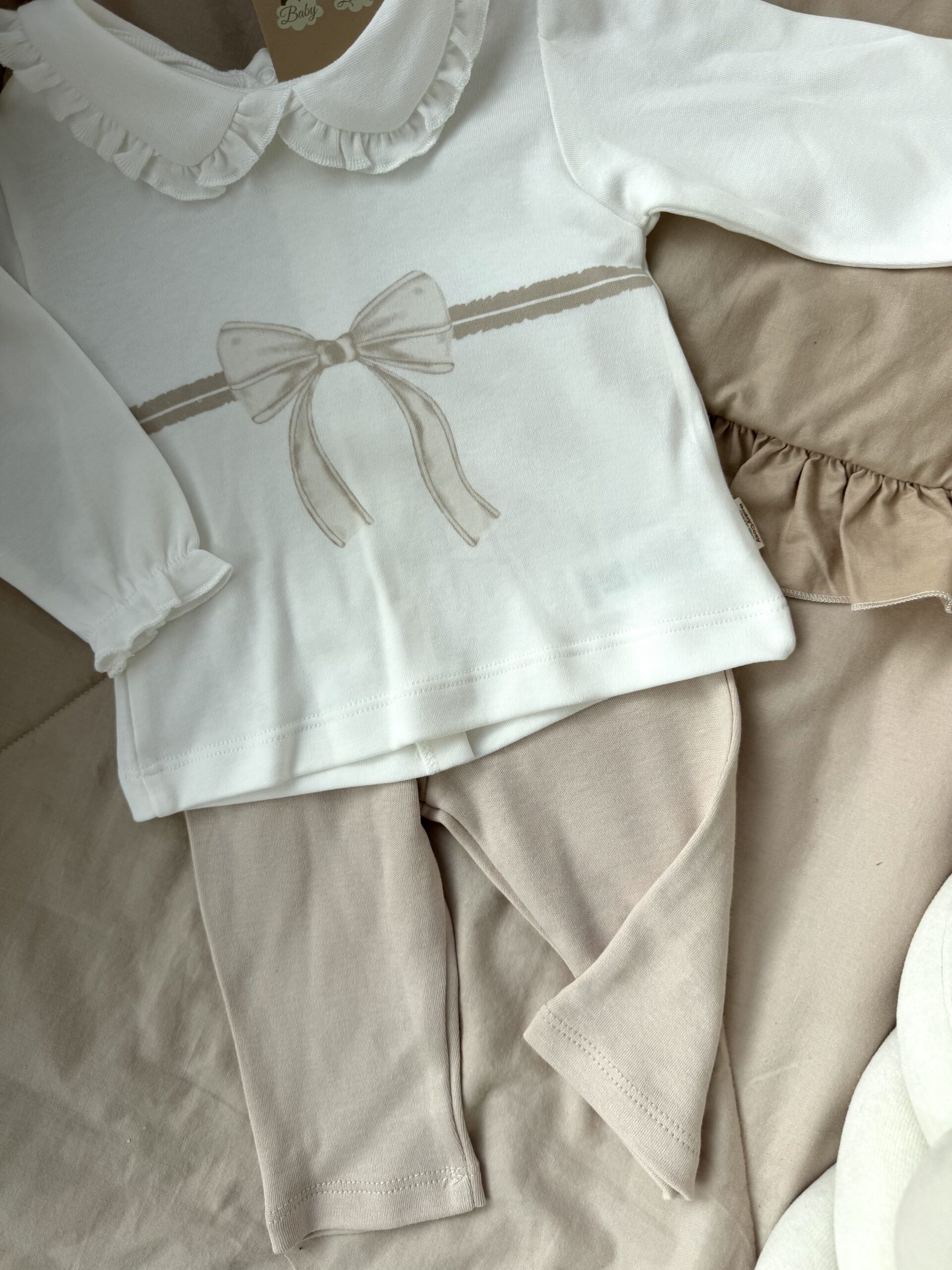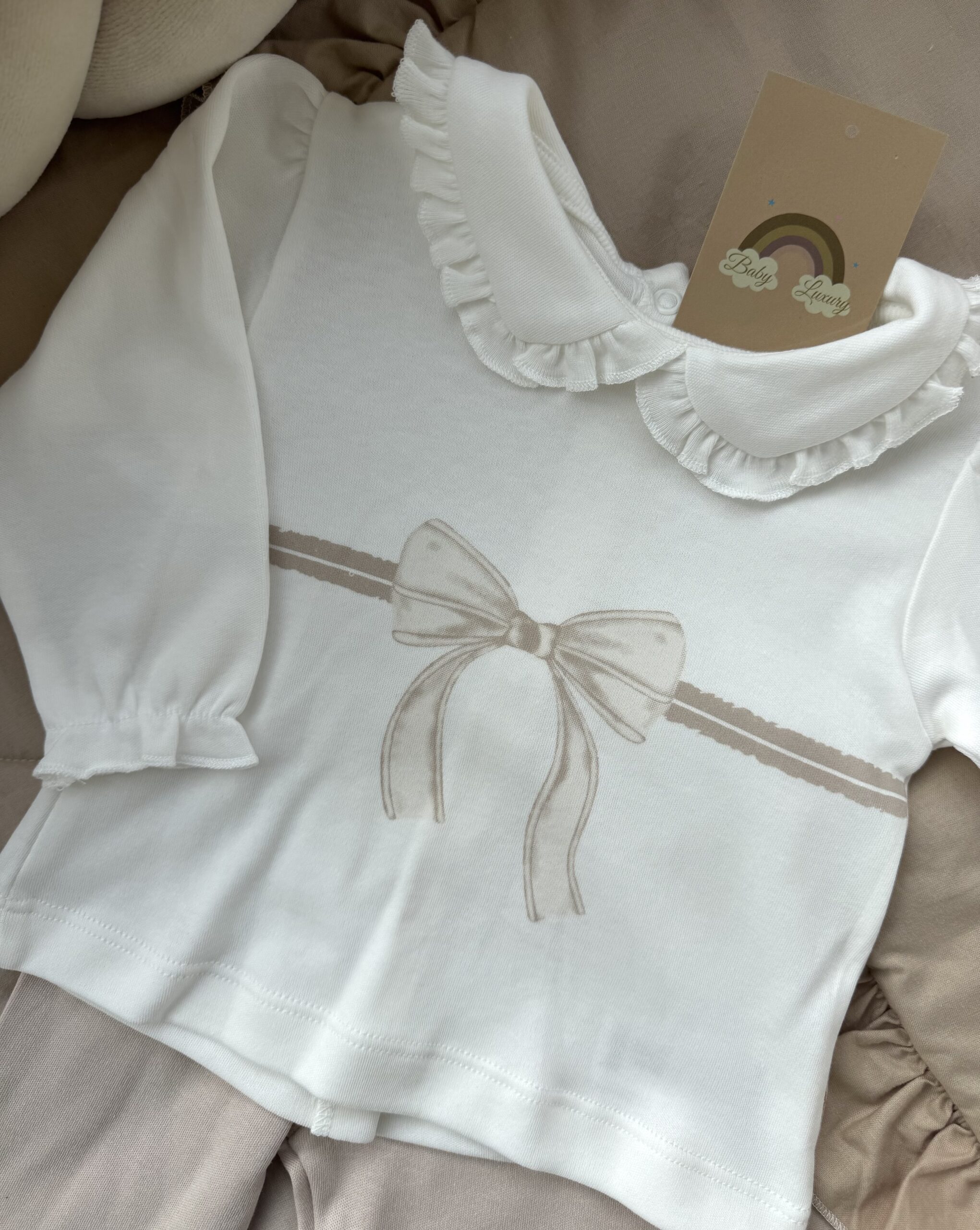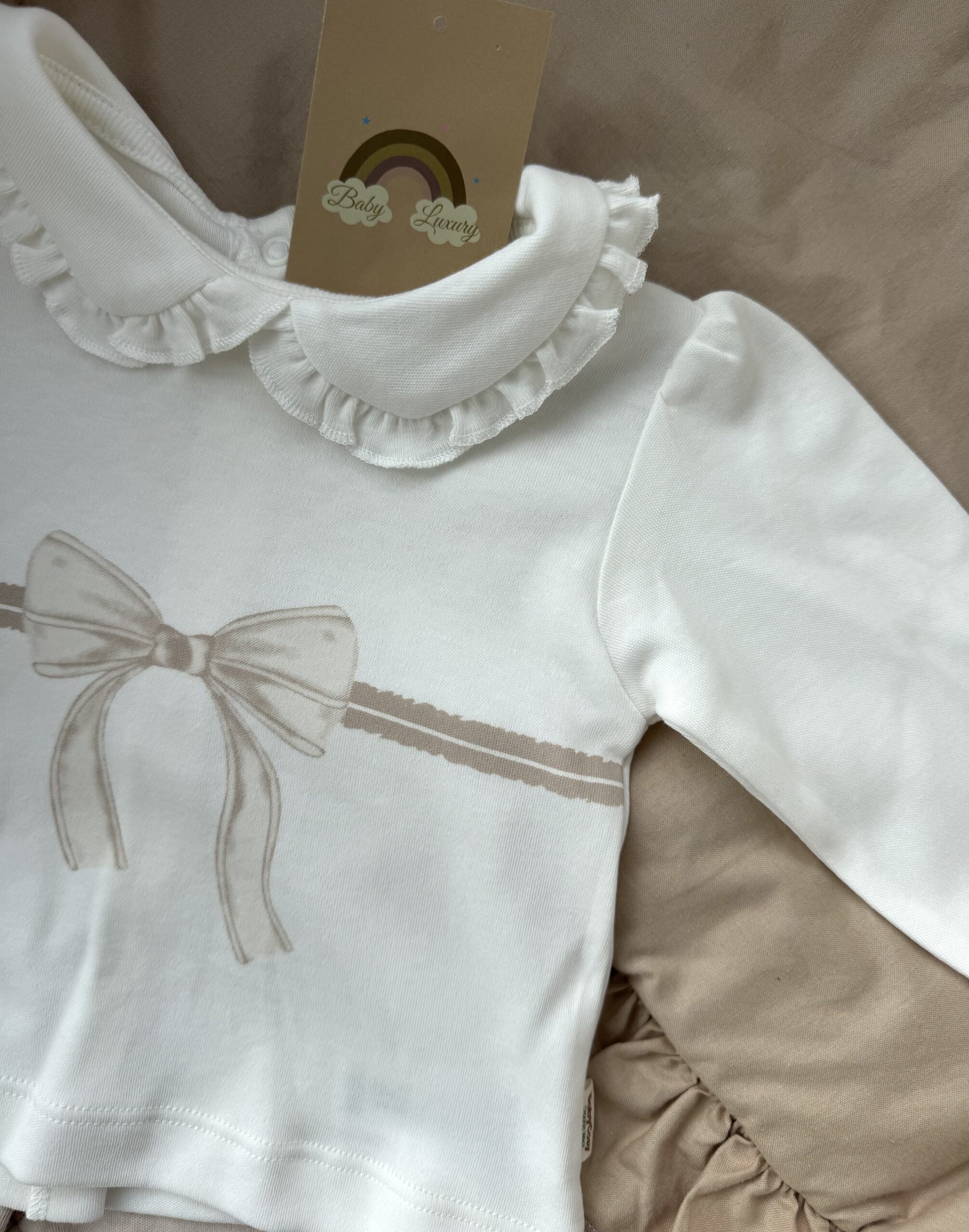 Een tweedelige set in de kleur Beige Creme. De set is gemaakt van 100% biologisch katoen. De set heeft ruffle afwerkingen en een grote beige strik.