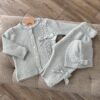 De set heeft een gebreid motief, parel afwerkingen, een strikje en een bijpassend mutsje.