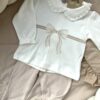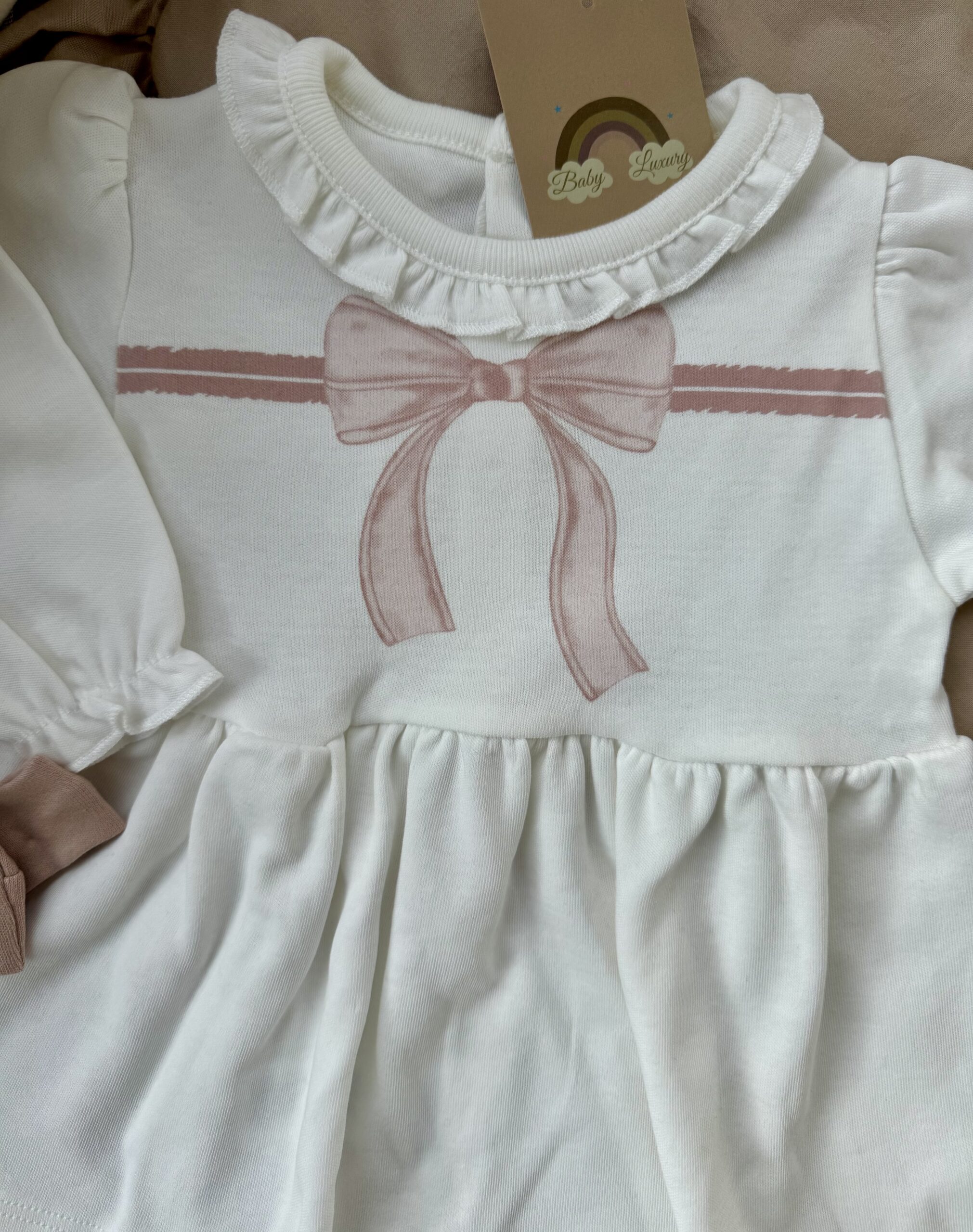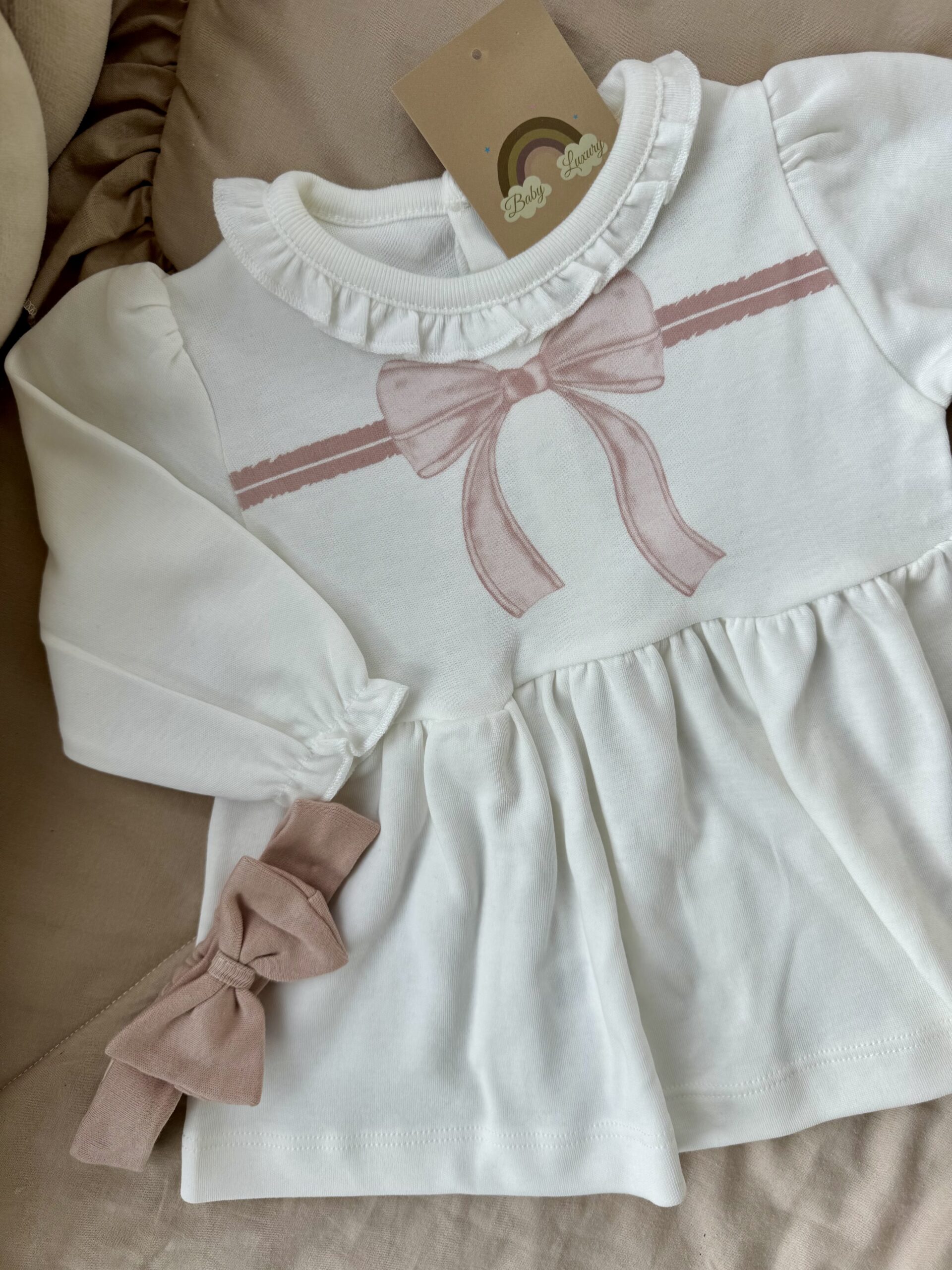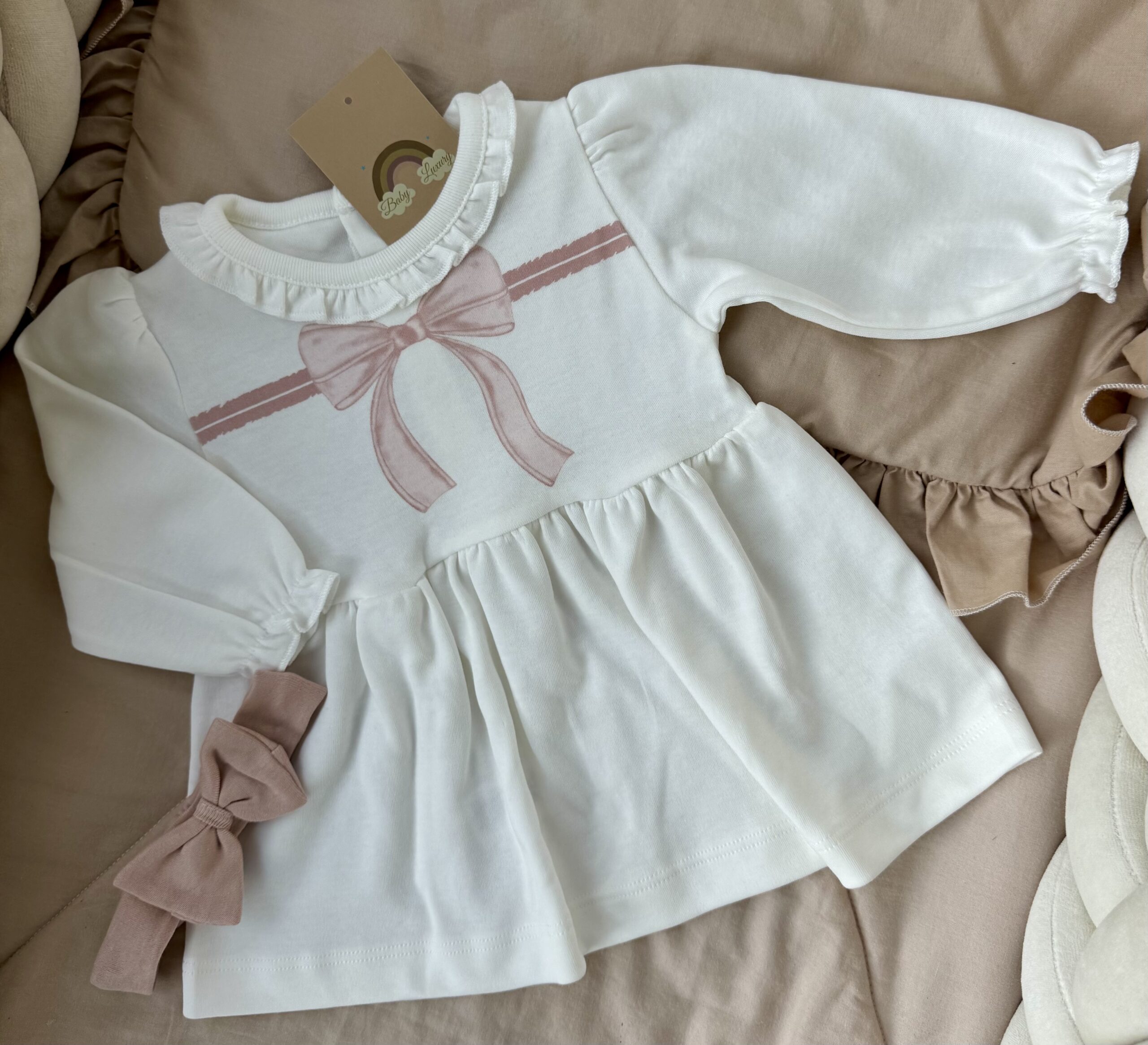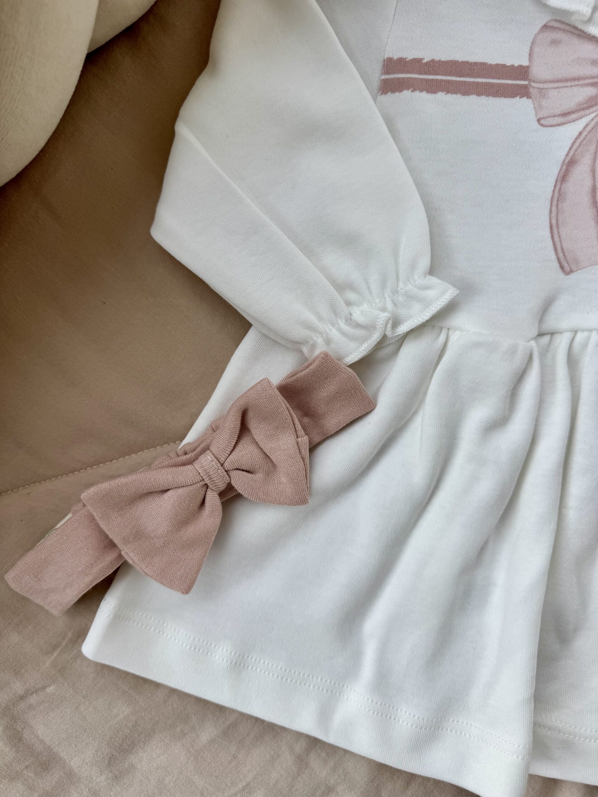 Een jurkje met een bijpassend haarbandje in de kleur Creme-OldPink. De set is gemaakt van 100% biologisch katoen. Het jurkje heeft een roze strik en ruffle afwerkingen.
