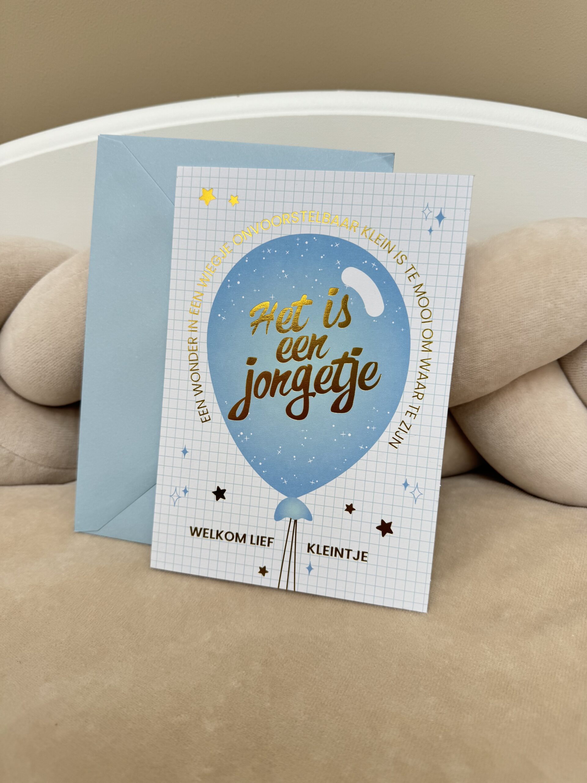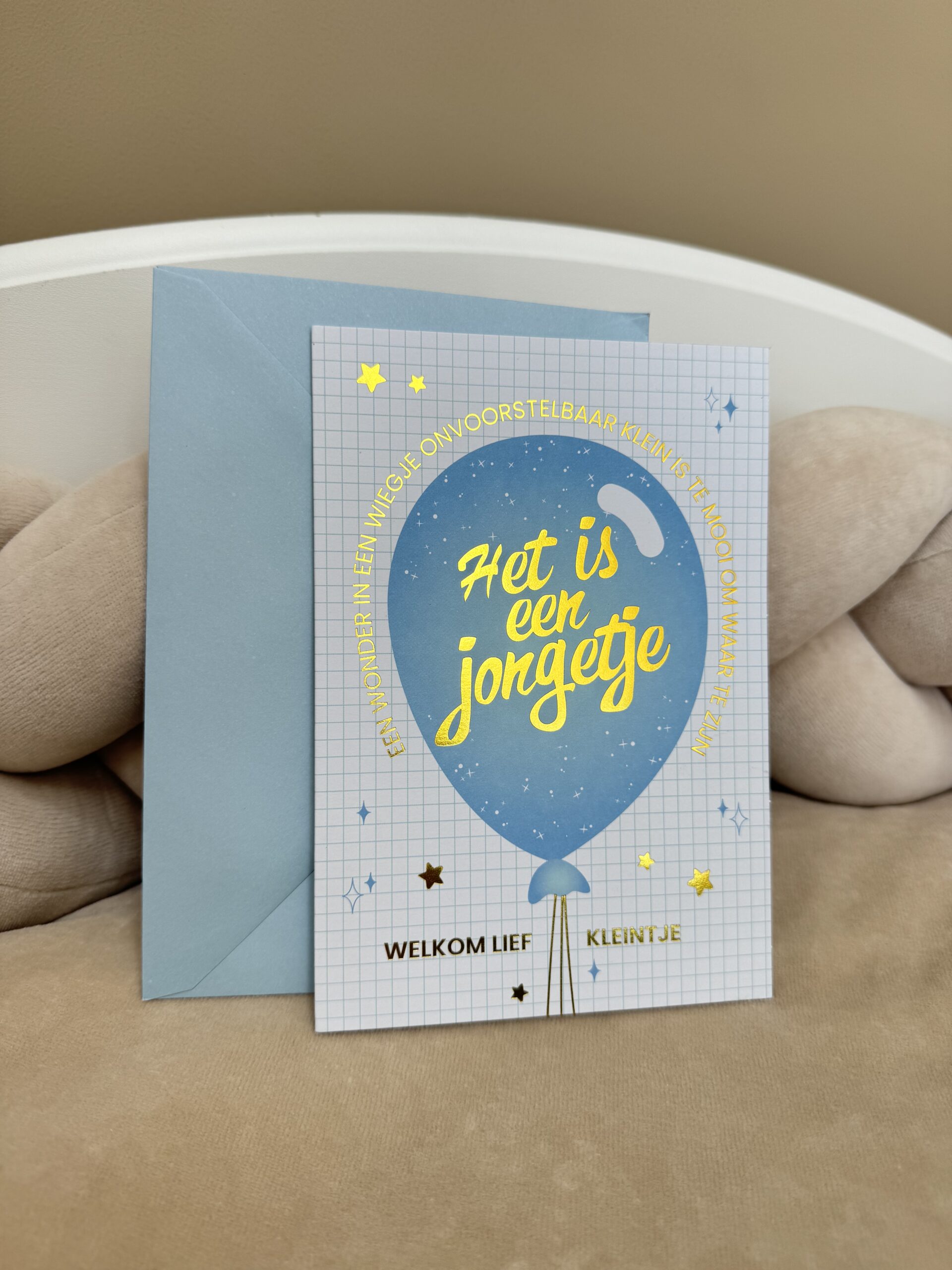 Inclusief een blauwe enveloppe.